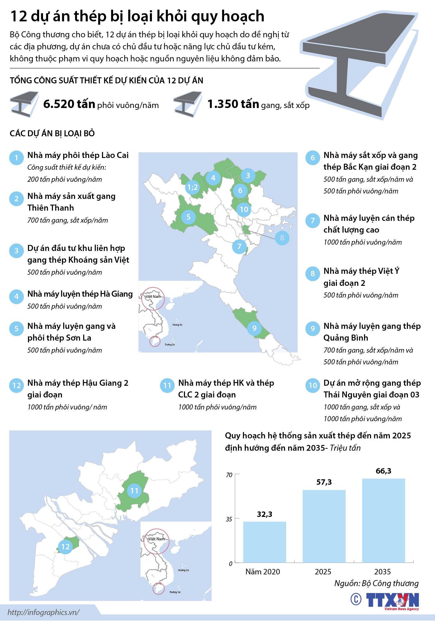 Bộ Công thương cho biết, 12 dự án thép bị loại khỏi quy hoạch do đề nghị từ các địa phương, dự án chưa có chủ đầu tư hoặc năng lực chủ đầu tư kém, không thuộc phạm vi quy hoạch hoặc nguồn nguyên liệu không đảm bảo.