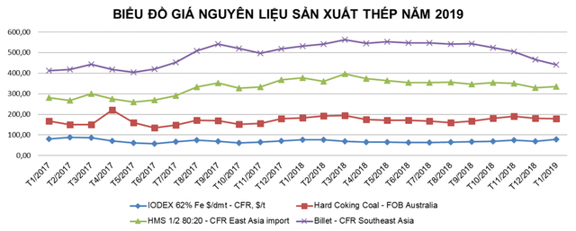 Đối với thị trường nguyên liệu sản xuất thép, giá quặng sắt loại 62%Fe ngày 12/2/2019 giao dịch ở mức 87-88 USD/Tấn CFR cảng Thiên Tân, Trung Quốc, tăng khoảng 12-15 USD/tấn so với hồi đầu tháng 1/2019. Giá phôi thép tiếp tục tăng 10 USD so với đầu tháng 1 lên 468 – 472 USD/tấn vào ngày 12/2. Tuy nhiên, so với cùng kỳ năm 2018, giá vẫn thấp hơn khoảng 40 USD/tấn.