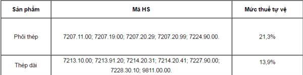 Theo thông báo kèm theo Quyết định này, mức thuế tự vệ đối với phôi thép là 23,3% và thép dài là 15,4% sẽ kết thúc vào ngày 21/3/2017.