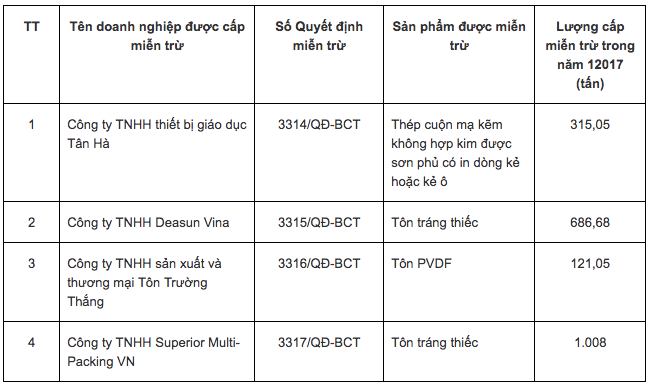 Sau khi thẩm định hồ sơ của 6 doanh nghiệp, Bộ Công Thương đã quyết định miễn trừ áp dụng biện pháp tự vệ đối với tôn màu nhập khẩu cho 4 doanh nghiệp trong năm 2017.