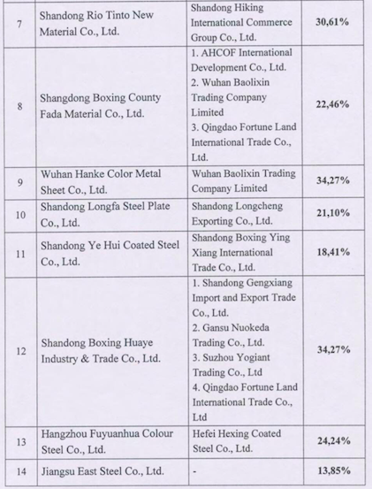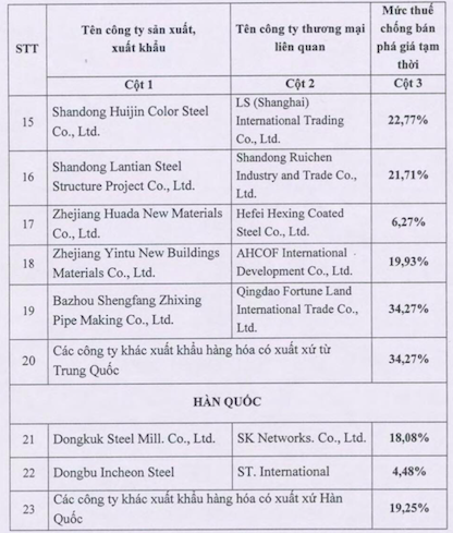 Cụ thể, mức thuế CBPG tạm thời dao động trong khoảng 3,45 – 34,27% được áp dụng đối với hơn 20 công ty. Trong đó, hàng loạt công ty Trung Quốc chịu mức thuế cao nhất là 34,27% như Shangdong Boxing Huaye Industry & Trade Co.,Ltd., Wuhan Hanke Color Metal Sheet Co., Ltd, Bazhou Shengfang Zhixing Pipe Making Co.,Ltd….
