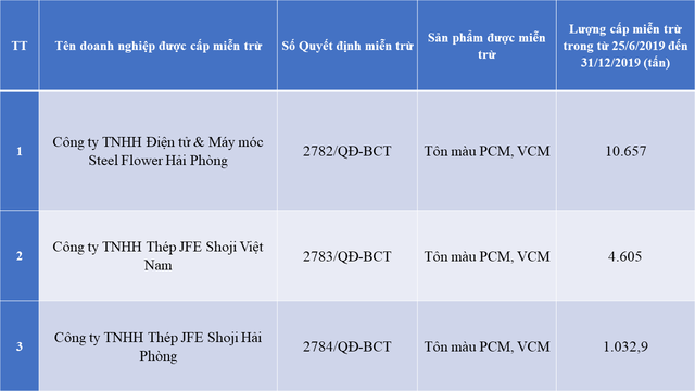 Bộ Công Thương đã ban hành quyết định miễn trừ áp dụng biện pháp chống bán phá giá và biện pháp tự vệ đối với 16.294,9 tấn tôn phủ màu PCM, VCM của 3 công ty.