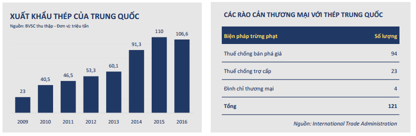 Theo BVSC, Việt Nam không phải là quốc gia duy nhất phải lập rào cản với thép Trung Quốc. Trong giai đoạn 2014 – 2016, nhu cầu tiêu thụ nội địa của Trung Quốc yếu và dư thừa công suất đã khiến các doanh nghiệp thép nước này chấp nhận thua lỗ, bán dưới giá thành để đẩy mạnh xuất khẩu.