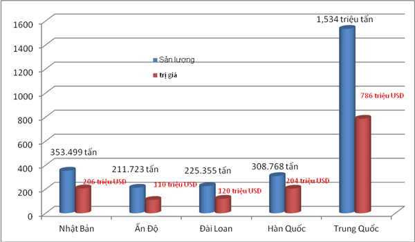 Các thị trường nhập khẩu sắt thép của nước ta đến từ nhiều quốc gia, vùng lãnh thổ ở khắp thế giới nhưng tập trung lớn nhất vào các thị trường ở khu vực châu Á như: Trung Quốc 1,534 triệu tấn, tổng giá trị kim ngạch 786 triệu USD (số liệu cập nhật theo thị trường của Tổng cục Hải quan đến hết tháng 2); Nhật Bản 353.449 tấn, trị giá kim ngạch 206 triệu USD; Hàn Quốc đạt 308.768 tấn, trị giá kim ngạch 204 triệu USD; Đài Loan đạt 225.355 tấn, trị giá 120 triệu USD; Ấn Độ đạt 211.723 tấn, trị giá 110 triệu USD…
