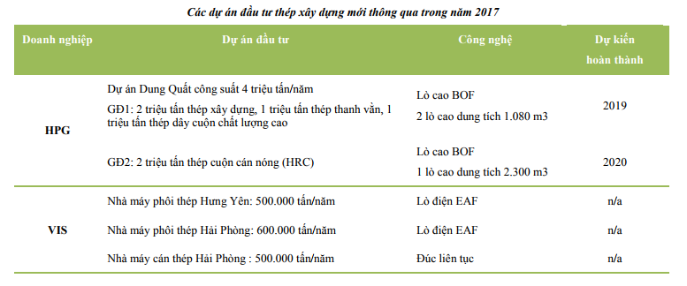 Xu hướng đầu tư mở rộng ở các doanh nghiệp thép cũng là yếu tố đáng quan tâm. Những doanh nghiệp hồi phục mạnh mẽ trong năm 2016 mạnh tay đầu tư vào công nghệ lò cao và nâng công suất sản xuất để có thể cạnh tranh với các doanh nghiệp Trung Quốc khi thuế tự vệ hết hiệu lực. Điểm rơi công suất tập trung trong năm 2019-2020.