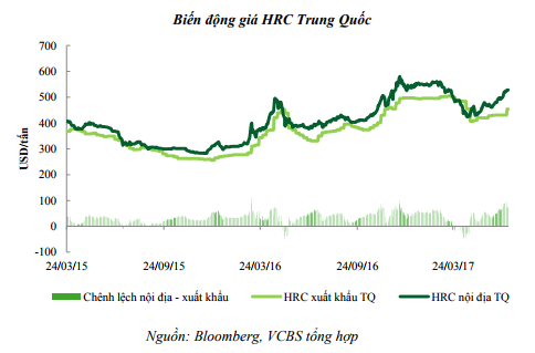 Bên cạnh đó, giá thép cuộn cán nóng (HRC) tăng mạnh trong nửa cuối quý II và được kỳ vọng duy trì xu hướng tăng trong nửa cuối năm, điều này sẽ tác động tích cực lên biên lợi nhuận gộp nhóm tôn mạ. VCBS cho biết, giá HRC tăng dựa vào các yếu tố như nguồn cung bị thắt chặt khi các nhà máy thép Trung Quốc nhỏ lẻ không đạt tiêu chuẩn phải đóng cửa, biên lợi nhuận của các nhà sản xuất thép tại Trung Quốc đang dần mở ra. Bên cạnh đó, giá HRC nội địa và HRC xuất khẩu của Trung Quốc đang có sự chênh lệch khá lớn, Hiện tượng này xảy ra do tính đầu cơ cao trên thị trường hàng hóa Trung Quốc xuất phát từ việc thắt chặt công suất nội địa tại nước này. Mức chênh lệch này sẽ thu hẹp lại trong thời gian tới, tạo ra dư địa tăng cho lượng HRC nhập khẩu về Việt Nam.