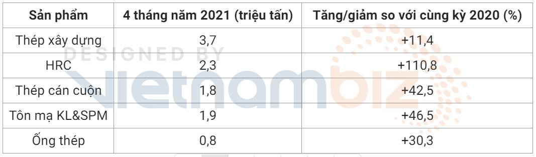Theo số liệu của VSA, trong 4 tháng đầu 2021, các doanh nghiệp thành viên của hiệp hội đã sản xuất khoảng 10,5 triệu tấn thép thành phẩm các loại, tăng 38,3% so với cùng kỳ năm 2020.