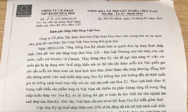 Trong văn bản số 29/CV-HSG/2018 ngày 13/3 của Công ty CP Tập đoàn Hoa Sen kiến nghị tới VSA, ông Vũ Văn Thanh – Phó Tổng Giám đốc Công ty cho biết, việc Hoa Kỳ áp thuế nhập khẩu mức 25% sẽ tác động lớn tới tình hình nhập xuất thép của Tập đoàn Hoa Sen nói riêng và các DN xuất khẩu thép của Việt Nam nói chung.