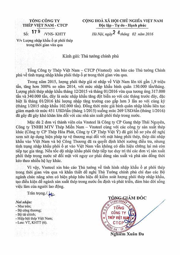 Cũng với nội dung tương tự, Công văn kiến nghị của Hiệp hội Thép Việt Nam do Chủ tịch Hồ Nghĩa Dũng ký lại cho biết: Không chỉ nhập khẩu ồ ạt mà giá bình quân nhập khẩu còn liên tục giảm mạnh từ mức 451 USD/tấn (tháng 1/2015) xuống mức 269 USD/tấn (tháng 1/2016), thấp hơn nhiều so với giá bán trong nước (khoảng 7,5 triệu đồng/tấn, tương đương với 330 USD) nên không thể cạnh tranh được với phôi thép nhập khẩu, đặc biệt là từ Trung Quốc, khiến nhiều doanh nghiệp nội bị thu hẹp thị phần, chỉ vận hành khoảng 50% công suất. Nếu tình trạng này vẫn tiếp tục diễn ra thì khả năng các nhà máy của Việt Nam đóng cửa là điều khó tránh khỏi.