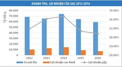 Theo báo cáo tài chính năm 2016, doanh thu thuần của GAS đạt 59.209 tỷ đồng, lợi nhuận sau thuế 7.237 tỷ đồng, giảm lần lượt 8% so và 20% so với năm 2015.