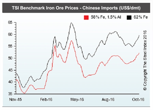 Cụ thể, giá quặng sắt, thép phế liệu, phôi thép đang tăng. Giá quặng sắt loại 62% Fe ngày 4/11 ở mức 64,7 USD/tấn CFR cảng Thiên Tân, tăng hơn 10 USD/tấn so với đầu tháng 10 và tăng tới 18,7% trong bốn tuần trở lại đây.