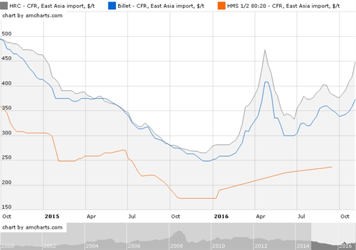 Giá quặng sắt, thép phế liệu, phôi thép và HRC đều đang tăng.
