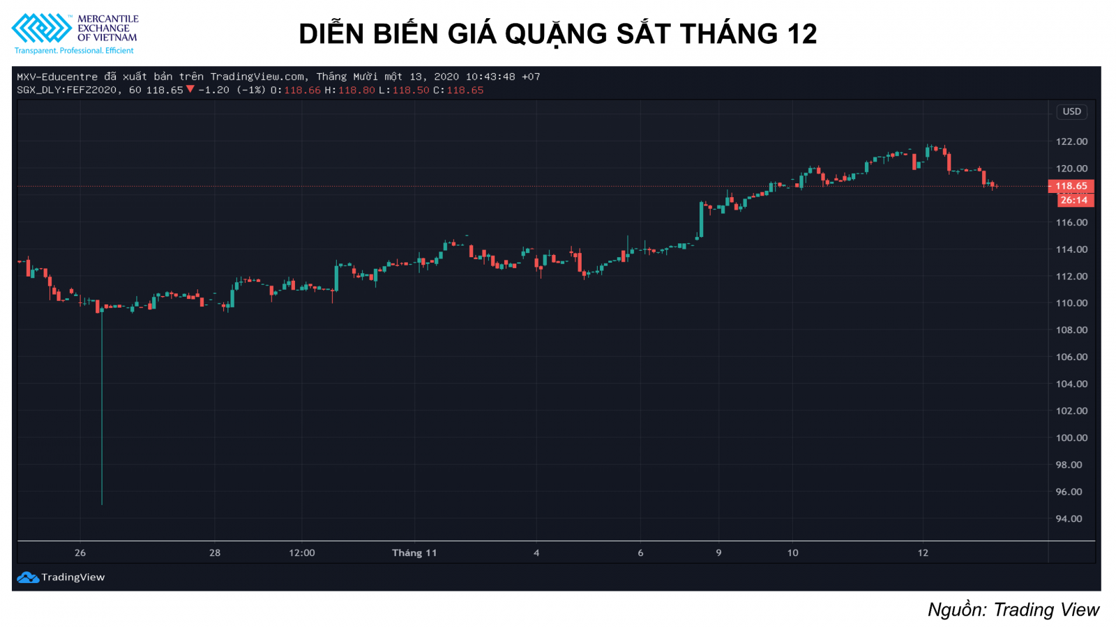 Đóng cửa ngày giao dịch 12/11, giá quặng sắt giảm 1.04% xuống chỉ còn 119.85 USD/tấn khi kết phiên, sau khi tăng liên tiếp sáu phiên bắt đầu từ tuần trước. Đà giảm điều chỉnh này của quặng sắt diễn ra trong bối cảnh tâm lý chốt lời của giới đầu tư chiếm ưu thế trên thị trường, tuy nhiên tâm lý “bullish” vẫn được duy trì nhờ nhu cầu sắt thép tăng vọt tại Trung Quốc.