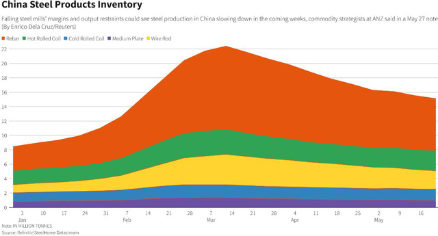 Do nhu cầu thép tăng mạnh, tồn kho thép ở Trung Quốc vẫn đang giảm. Theo đó, tồn kho thép thanh vằn tại các nhà máy thép và các kho bãi tập kết ở Trung Quốc tính đến ngày 27/5 là 10,57 triệu tấn, giảm 0,3% so với một tuần trước đó.