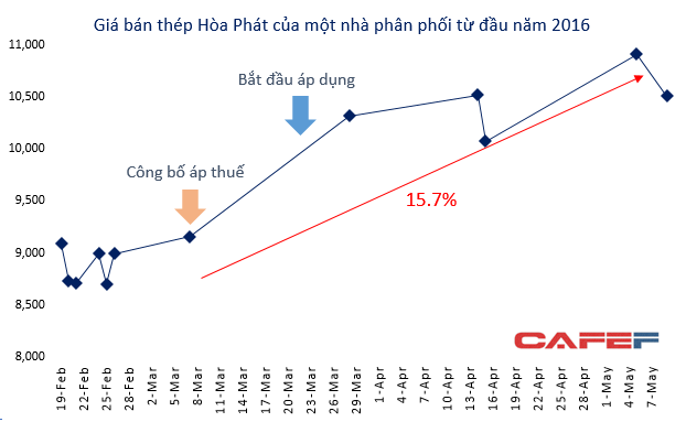 Thị trường thép Việt Nam từ đầu năm 2016 chịu tác động lớn bởi quyết định áp thuế tự vệ tạm thời đối với sản phẩm phôi thép và thép dài nhập khẩu của Bộ Công Thương. Giá và sản lượng tiêu thụ thép đều tăng mạnh trở lại.
