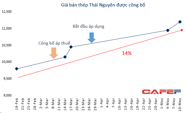 Còn tại nhà máy Gang thép Thái Nguyên, giá bán được công bố cũng tăng 14% đối với nhóm sản phẩm tương tự trong khoảng thời gian từ 19/2 đến 10/5.