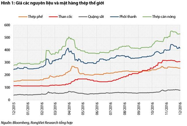 RongViet Research cho biết, trong năm 2016, ngành thép thế giới chứng kiến cú sốc giá nguyên liệu bắt nguồn từ chính sách kiểm soát hoạt động sản xuất gang thép tại Trung Quốc. Với mục tiêu loại bỏ các xưởng thép nhỏ, kém hiệu quả để tái cơ cấu ngành thép, Trung Quốc giảm giới hạn số ngày hoạt động tại các mỏ than cốc, khiến nguyên liệu này tăng 247% giá chỉ sau 6 tháng, giá cao nhất gần 309USD/tấn trong tháng 11/2016. Điều này kéo theo giá thép phế và giá quặng sắt cũng tăng mạnh, hiện tại đã cao hơn 67% và 85% so với cùng kỳ.
