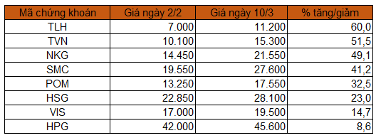 Cổ phiếu NKG của Thép Nam Kim tăng từ vùng 15.000 đồng/cp lên 21.500 đồng/cp từ giữa tháng 2. Cổ phiếu SMC của Đầu tư Thương Mại SMC tăng 45% kể từ đầu tháng 2 lên 27.600 đồng/cp. Cổ phiếu Tổng công ty Thép Việt Nam (UPCoM: TVN) tăng giá từ vùng 10.000 đồng/cp lên 15.700 đồng/cp, Hoa Sen (HoSE: HSG) tăng 23%, Thép Việt Ý (HoSE: VIS) tăng 19%…