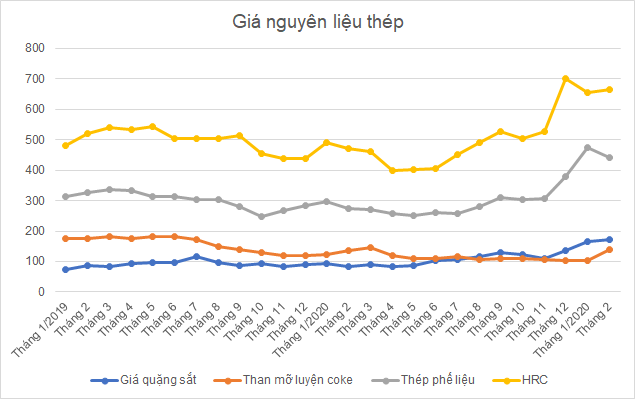 Nguyên nhân được VSA lý giải là do giá các loại nguyên vật liệu sản xuất thép tăng cao đột biến trên thị trường toàn cầu đẩy giá thép thành phẩm tăng cao. Cụ thể, giá quặng sắt tính đến đầu tháng 3 ghi nhận mức trên 170 USD/tấn, tăng 55% so với cuối năm 2020 và gấp đôi cùng kỳ năm trước; giá thép cuộn cán nóng (HRC) ghi nhận 660 USD/tấn, giảm 6% so với cuối năm và tăng 44% so cùng kỳ năm trước.