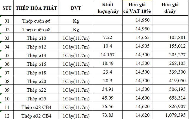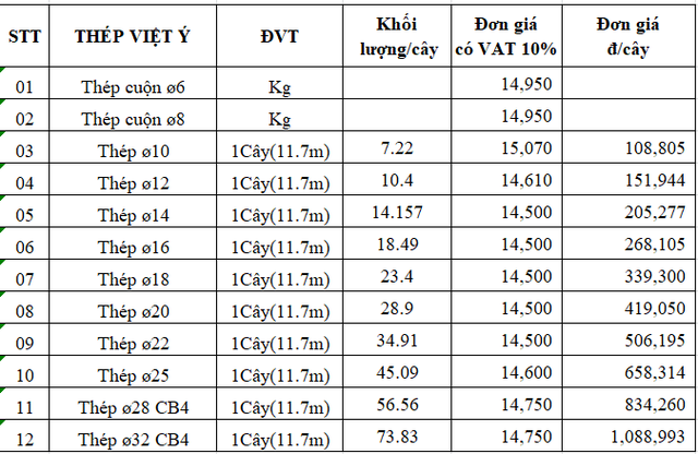 Đối với thép Hòa Phát, thép Việt Ý, giá các loại thép thành phẩm cũng tăng mạnh so với khoảng một tháng trước. Đến ngày 14/2, giá thép cuộn, thép cây đồng loạt tăng 400 đồng/cây (đã bao gồm 10% VAT). Riêng thép D12 tăng mạnh 800 đồng/cây.