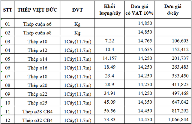 Tương tự, chỉ chưa đầy 1 tháng, Công ty CP Sản xuất thép Việt Đức cũng liên tiếp tăng giá bán thép hai lần. Thép Việt Đức báo giá thép cuộn rút dây SAE1008, CB240 tăng 300.000 đồng/tấn (chưa bao gồm 10% VAT) từ ngày 13/2. Đến hôm nay, một nguồn tin thân cận cho biết công ty tiếp tục tăng giá thép cây D10 thêm 100.000 đồng/tấn.
