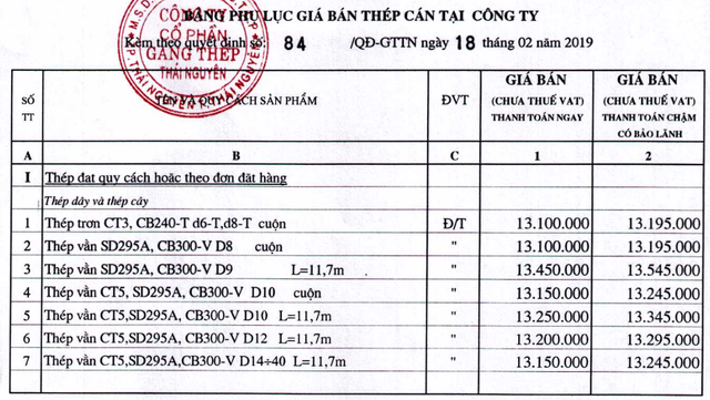 Công ty CP Gang thép Thái Nguyên (Tisco) ngày 18/2 cũng nâng giá thép thành phẩm. Trong đó, thép thanh vằn D10 tăng 200.000 đồng/tấn, thép cuộn, D12 và D14 trở lên tăng 150.000 đồng/tấn. Giá các sản phẩm thép xây dựng dự án các loại cũng tăng 150.000 đồng/tấn. Đây là lần tăng giá thứ 4 của công ty kể từ cuối tháng 12 năm ngoái. Trong vòng chưa đầy 2 tháng, giá thép trơn tăng 600.000 đồng/tấn từ 12,5 triệu đồng/tấn lên 13,1 triệu đồng/tấn (chưa VAT) trong khi thép vằn tăng từ 12,85 triệu đồng/tấn lên 13,45 triệu đồng/tấn (chưa VAT).