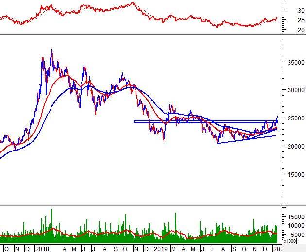 Đầu năm 2020, giá HPG đã bứt phá vượt qua ngưỡng kháng cự trên. Theo lý thuyết phân tích kỹ thuật thì vùng 24,000-24,500 sẽ chuyển từ kháng cự trở thành vùng hỗ trợ trong thời gian tới nếu có điều chỉnh mạnh bất ngờ (thrust down).