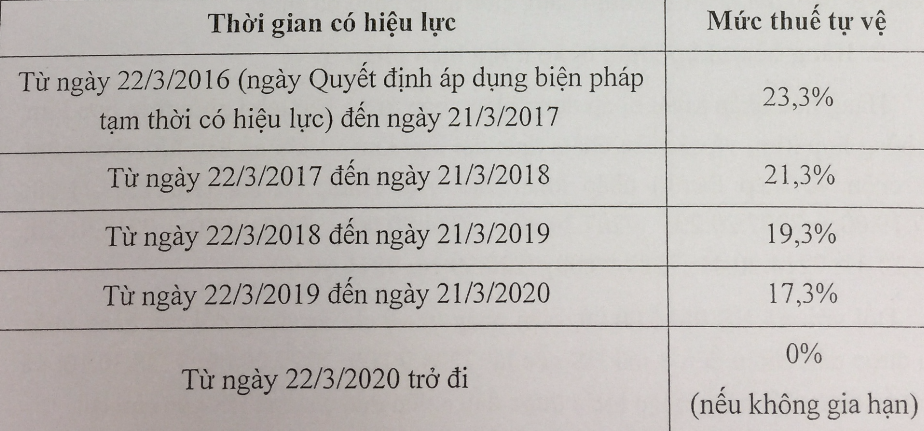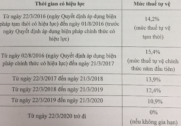 Thời gian áp dụng biện pháp tự vệ này trong bốn năm, kể từ ngày Quyết định áp dụng biện pháp tự vệ tạm thời có hiệu lực. Sau khi biện pháp tự vệ chính thức có hiệu lực, Tổng cục Hải quan sẽ tiến hành thu thuế nhập khẩu bổ sung đối với hàng hóa thuộc đối tượng áp thuế.