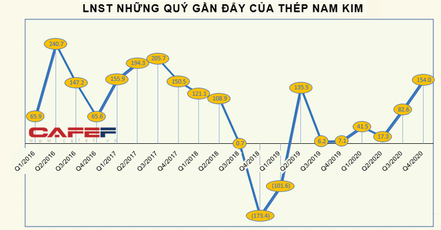 Quý 4 vừa qua Thép Nam Kim báo lãi sau thuế 154 tỷ đồng, nâng tổng lợi nhuận sau thuế cả năm lên 295 tỷ đồng, gấp 6,3 lần lợi nhuận đạt được năm 2019. Thép Nam Kim đang tập trung chiến lược kinh doanh, tiếp cận thị trường Miền Trung, cải thiện dòng tiền và cơ cấu nợ. Lợi nhuận sau thuế quý 4 cũng tăng đột biến so với các quý đầu năm 2020.