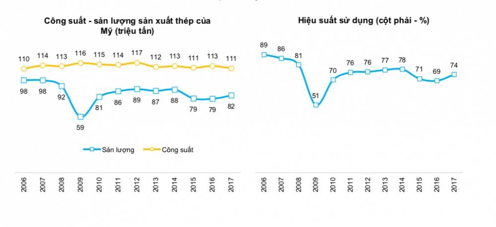 Trong 10 năm trở lại đây, ngành thép của Mỹ ở trạng thái ổn định khi công suất sản xuất gần như không thay đổi (110 – 117 triệu tấn/năm). Hiệu suất sử dụng bình quân của ngành ở mức 73,9% vào năm 2017. Để thỏa mãn nhu cầu tiêu thụ 106 triệu tấn năm 2017, các nhà máy bình quân phải chạy với hiệu suất 95%, mức hiệu suất gần như không thể đạt được đứng trên góc độ quy mô cả một ngành sản xuất.