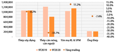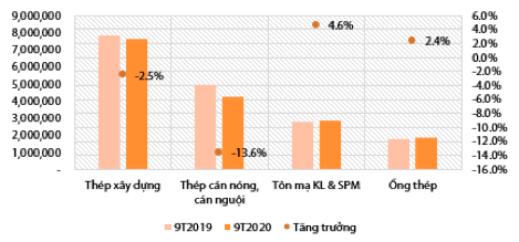 Chi tiết, tiêu thụ thép xây dựng giảm 2,5% do mức tăng trưởng chậm hơn của ngành xây dựng. Các hoạt động xây dựng chững lại trong giai đoạn dịch bùng phát đã khiến tăng trưởng của ngành xây dựng đã giảm từ 8,3% trong 9 tháng đầu năm 2019 về 5%. Ngược lại, sản lượng bán hàng của mảng tôn mạ đã tăng 4,6% nhờ sản lượng xuất khẩu tăng mạnh 11,2%. Tiêu thụ ống thép cũng tăng trưởng nhẹ 2,4% nhờ nhu cầu từ thị trường nội địa.