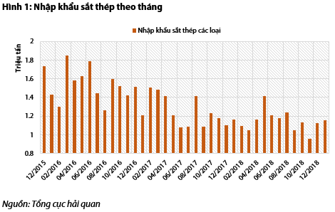 Trong năm 2018, trung bình mỗi tháng Việt Nam nhập khẩu 1,1 triệu tấn sắt thép các loại, thấp hơn 12% so với 2017 và thấp hơn 27% so với 2016. Đây có thể là thành tựu nổi bật của một giai đoạn ngành sản xuất thép trong nước phát triển mạnh về cả bề rộng (quy mô) và chiều sâu (chuỗi sản xuất). Theo chứng khoán Rồng Việt, nhập khẩu thép giảm do nhiều nguyên nhân khác nhau.