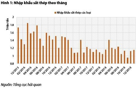 Theo số liệu của Tổng cục Hải quan, nhập khẩu sắt thép các loại vào Việt Nam có xu hướng giảm. Trong năm 2018, trung bình mỗi tháng Việt Nam nhập khẩu 1,1 triệu tấn sắt thép các loại, thấp hơn 12% so với 2017 và thấp hơn 27% so với 2016.
