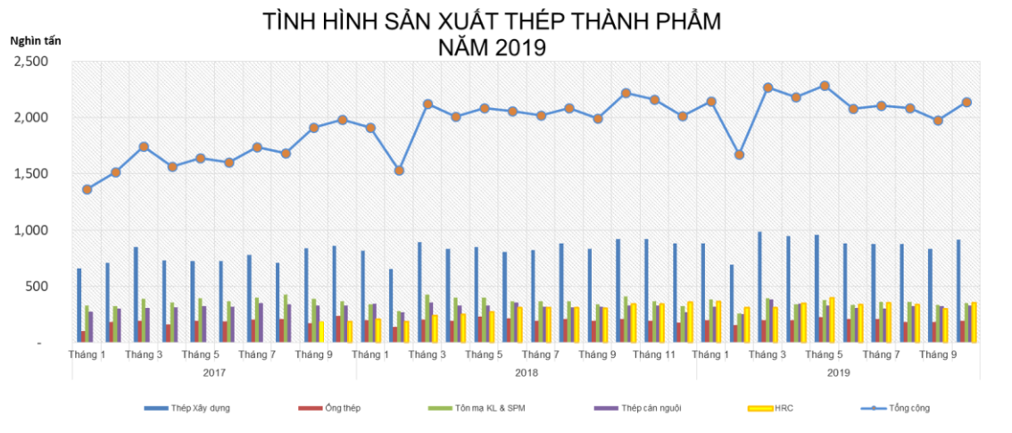 Thông tin từ Hiệp hội Thép Việt Nam (VSA) cho biết sản xuất thép trong tháng 10/2019 đạt 2,1 triệu tấn, tăng 8,42% so với tháng trước, nhưng giảm 3,5% so với cùng kì 2018.