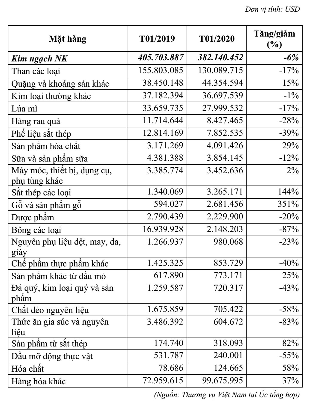 Kim ngạch nhập khẩu của Việt Nam từ Australia đạt hơn 382 triệu USD, giảm 6% so với cùng kì năm trước. Trong đó, than tiếp tục là mặt hàng Việt Nam nhập khẩu nhiều nhất với trên 130 triệu USD.