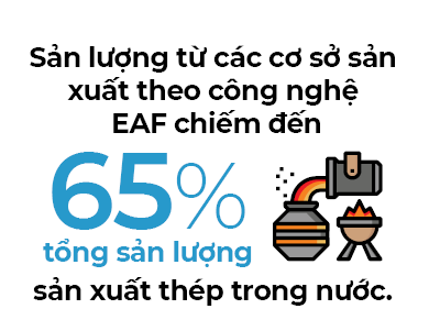 Theo VSA, sản lượng từ các cơ sở sản xuất theo công nghệ EAF chiếm đến 65% tổng sản lượng sản xuất thép trong nước. Với công nghệ này, mức tiêu thụ điện trên mỗi tấn khoảng 600kWh và tiền điện thường chiếm 8-9% tổng chi phí sản xuất – mức cao hơn hẳn so với tỉ lệ dưới 5% của các nhà máy dùng công nghệ BOF.