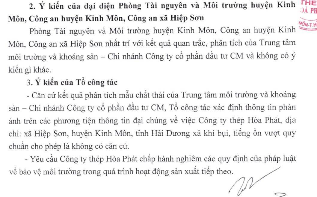 ‘Công ty CP Thép Hòa Phát Hải Dương cũng cho biết đã có nhiều đoàn nhà đầu tư và phóng viên báo chí cũng đã xuống thăm Khu liên hợp này và ghi nhận không khí trong Nhà máy trong sạch, không có mùi, hay khói bụi, cây cối xanh tốt, phát triển bình thường, đường xá quy củ, đảm bảo vệ sinh môi trường. Công ty CP Thép Hòa Phát Hải Dương cũng đã được cấp chứng nhận hoạt động theo tiêu chuẩn ISO về môi trường 14001:2015.