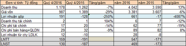 Kết quả kinh doanh quý 4/2016, doanh thu đạt 1.177,86 tỷ đồng, giảm 7% so với năm 2015. Tuy nhiên, giá vốn bỏ ra giảm sâu 29% nên lợi nhuận gộp từ bán hàng và cung cấp dịch vụ tăng đột biến lên gần 191 tỷ đồng trong khi năm 2015 lỗ gộp 127,5 tỷ đồng. Trong năm qua, giá thép có nhiều biến động và không ít doanh nghiệp trữ hàng giá rẻ hưởng lợi rất nhiều khi giá thép tăng.