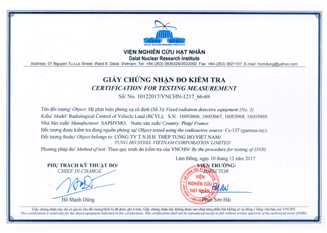 Bên cạnh đó, để đảm bảo sự an toàn cho người dung, Thép Tung Ho chủ động thiết lập hệ thống tầm soát phóng xạ tại nhà máy do Viện hạt nhân Việt Nhân kiểm nghiệm chứng nhận. Nguồn phế liệu đầu vào và thành phầm đầu ra được tầm soát phóng xạ đảm bảo sản phẩm không nhiễm phóng xạ trước khi đến tay người tiêu dùng.