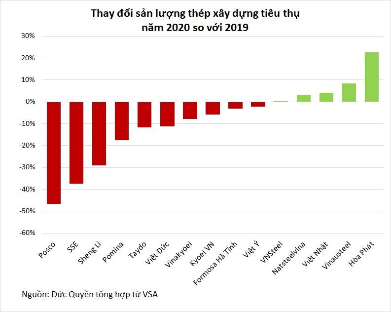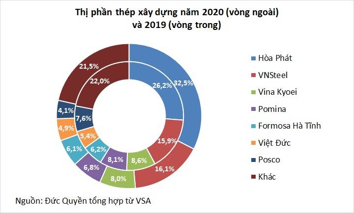 Xét về thị phần, Hòa Phát và VNSteel là hai tay chơi lớn duy nhất ghi nhận bước tiến so với năm trước. Vina Kyoei, Pomina, Formosa Hà Tĩnh, Thép Việt Đức, Posco đều chứng kiến thị phần tụt lùi.