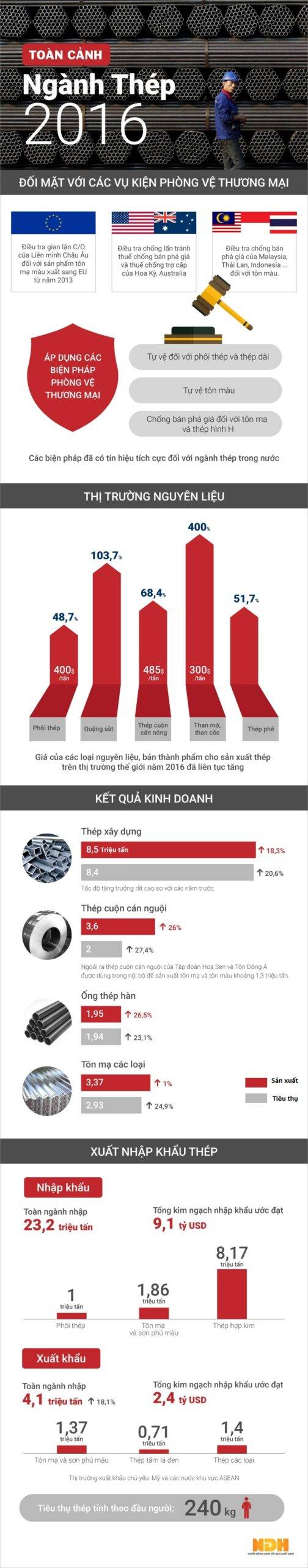 Bên cạnh đó, năm 2016 cũng là năm Chính phủ đã áp dụng các biện pháp phòng vệ thương mại (tự vệ đối với phôi thép và thép dài, tôn màu và chống bán phá giá đối với tôn mạ và thép hình H) để bảo vệ ngành thép trong nước. Các biện pháp này đã có tác dụng tích cực đối với ngành thép.