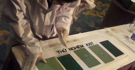 Ba tiếng sau khi nhỏ axit vào 5 loại tôn cho thấy 4 mẫu tôn nhập khẩu đều bị phồng rộp, phai màu, lớp sơn phủ và độ dày tôn cũng không đủ tiêu chuẩn và không đúng với thông số ghi trên biên tôn. Ảnh: T.G.