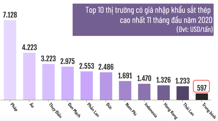 Thống kê cho thấy, giá nhập khẩu sắt thép từ Pháp cao nhất với bình quân 7.128 USD/tấn, bỏ xa các thị trường khác trong top 10 thị trường có giá nhập khẩu sắt thép cao nhất 11 tháng đầu năm 2020. Phần lớn giá nhập sắt thép cao rơi vào những thị trường châu Âu như Áo, Thụy Điển, Đan Mạch, Phần Lan, Đức…