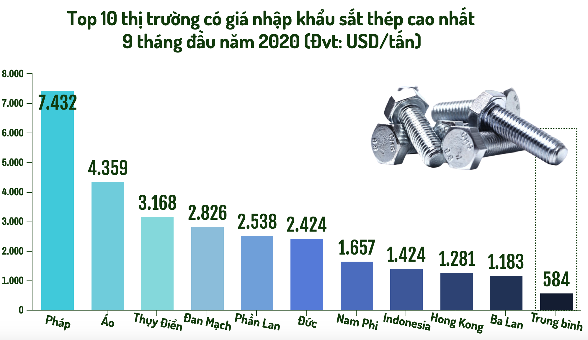 Xét về giá trong top 10 thị trường có giá nhập khẩu sắt thép cao nhất 9 tháng cho thấy hầu hết sắt thép từ châu Âu có giá cao, trong đó cao nhất từ Pháp với 7.432 USD/tấn, kế đến là Áo 4.359 USD/tấn…