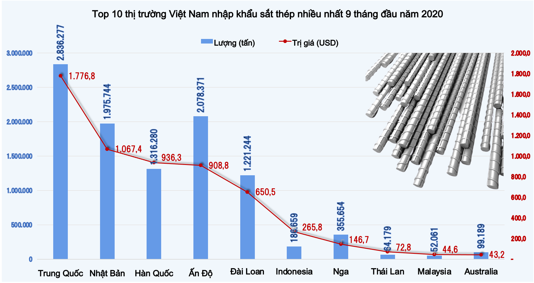 Xét top 10 thị trường Việt Nam nhập khẩu sắt thép nhiều nhất 9 tháng đầu năm nay ghi nhận kim ngạch và sản lượng nhiều nhất từ Trung Quốc, đạt hơn 2,8 triệu tấn trị giá 1,78 tỉ USD với giá 626,5 USD/tấn; so cùng kì năm ngoái giảm về lượng, kim ngạch và giá lần lượt 34%, 35% và 27%.