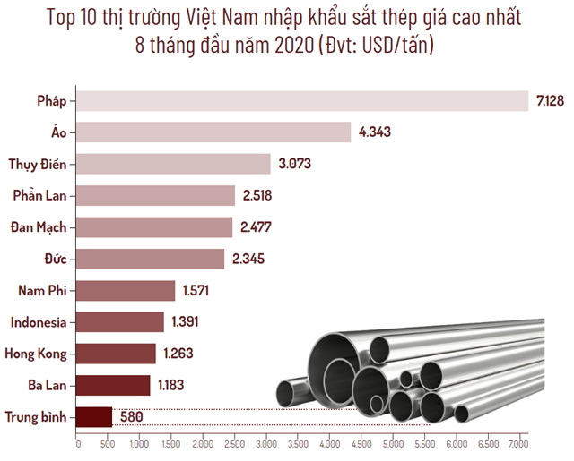 Xét về giá, sắt thép từ những nước thuộc EU có giá thành khá cao, trong đó cao nhất là từ Pháp với 7.128 USD/tấn; kế đến là Áo 4.343 USD/tấn; sắt thép nhập từ các nước Bắc Âu như Thụy Điển, Phần Lan, Đan Mạch hay Đức đều có giá trên 2.000 USD/tấn.