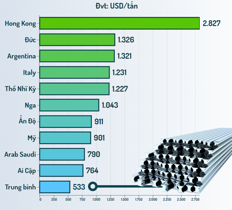 Xét về giá, sắt thép xuất sang Hong Kong cao nhất với 2.827 USD/tấn, gấp đến 5,3 lần mức giá xuất bình quân. Kế đến là một số thị trường châu Âu, châu Mỹ như Đức 1.326 USD/tấn, Argentina 1.321 USD/tấn, Italy 1.231 USD/tấn…