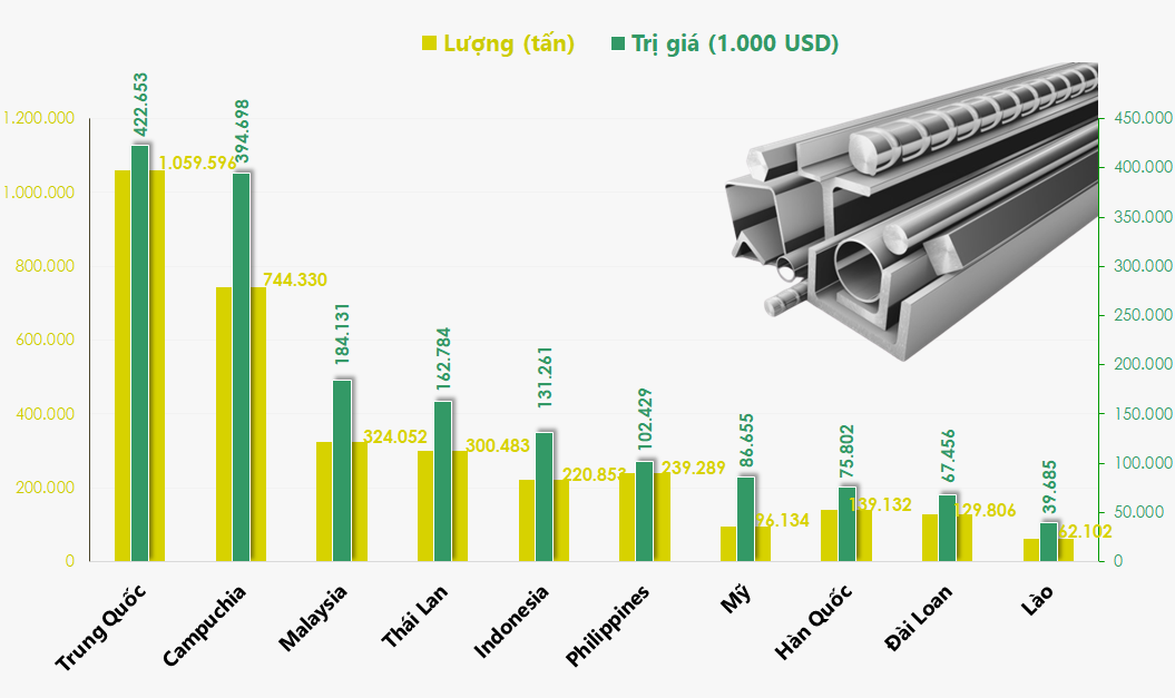 Qua đó đưa Trung Quốc vượt qua Campuchia vươn lên đứng đầu về thị trường tiêu thụ sắt thép của Việt Nam trong 6 tháng đầu năm nay với 1,06 triệu tấn tương đương gần 423 triệu USD, giá 398,9 USD/tấn. So cùng kì tăng đến 1.382% về lượng, tăng 1.052% về kim ngạch nhưng giảm 22,3% về giá.