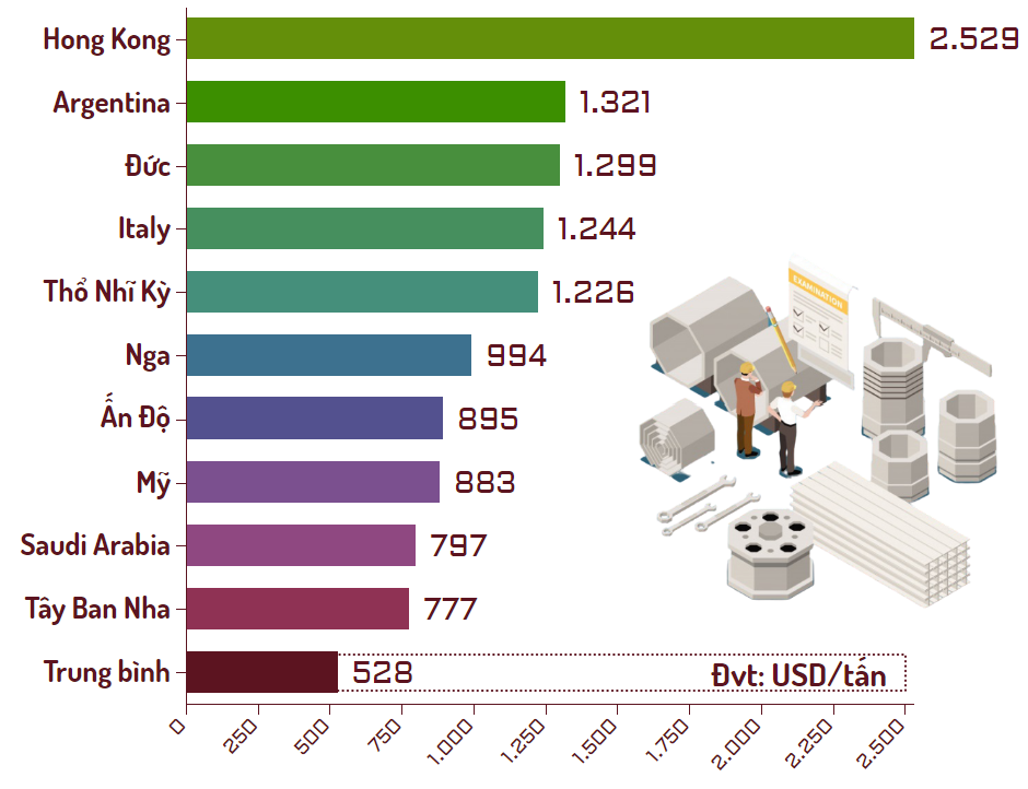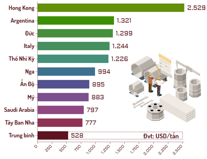 Top 10 thị trường xuất khẩu sắt thép Việt Nam được giá cao nhất cho thấy xuất sang Hong Kong có giá cao nhất 2.529 USD/tấn; kế đến là một số thị trường châu Âu đạt trên 1.000 USD như Argentina, Đức, Italy hay Thổ Nhĩ Kỳ…