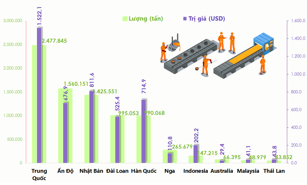 Top 10 thị trường xuất khẩu sắt thép Việt Nam được giá cao nhất 7 tháng đầu năm 2020